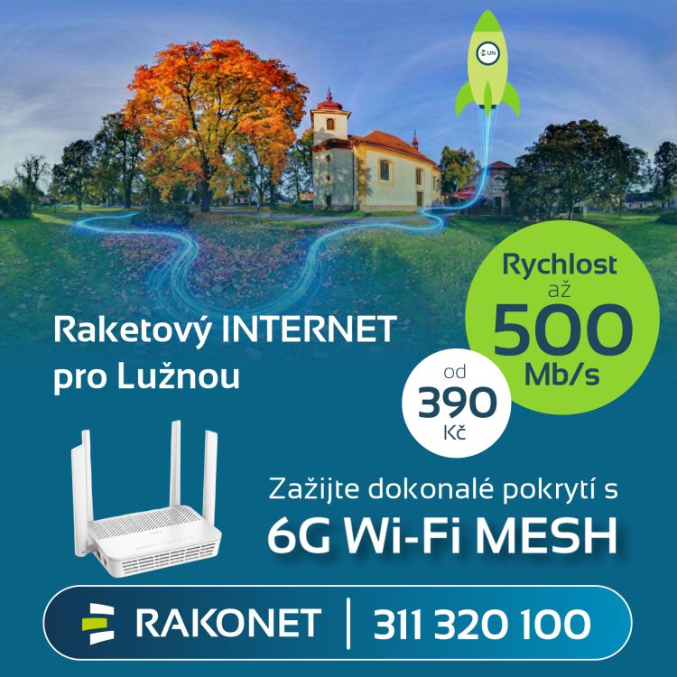 Zrychlujeme vaši obec. Díky modernizaci sítě RAKONET teď můžete v Lužné surfovat rychlostí až 500 Mb/s. To je kvalita srovnatelná s optikou, ale za lepší cenu.